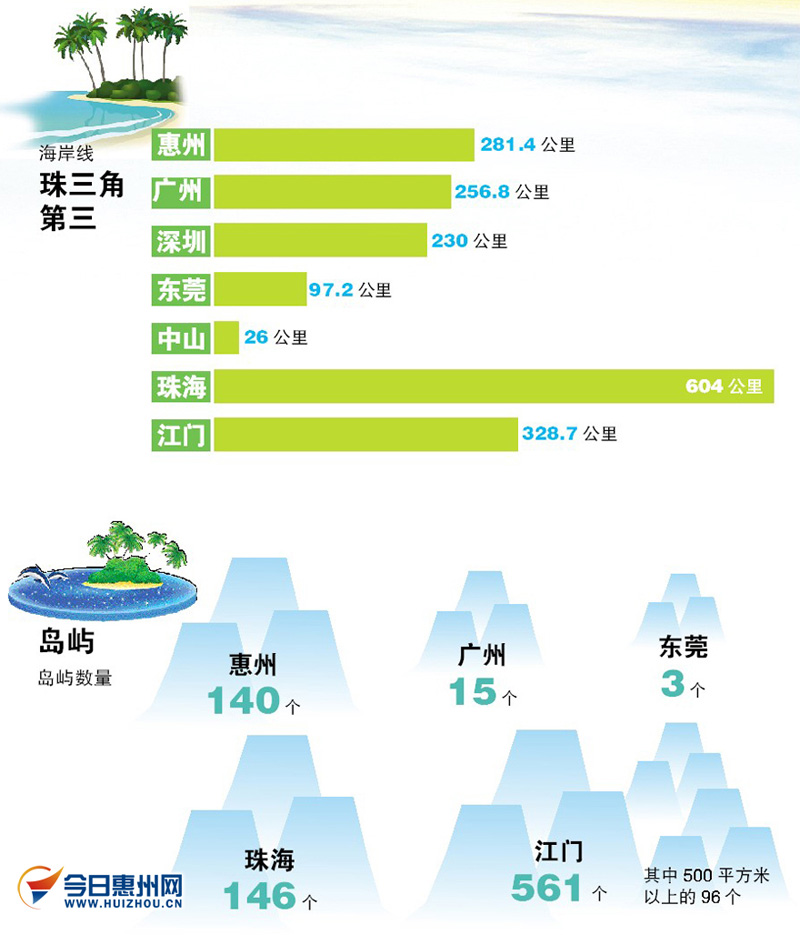 面朝大海,春暖花开,从以上珠三角各市不完全数据来看,惠州的海岸线长度和拥有的岛屿数,在珠三角中基本排在第三位。实际上,“大海”在广东来说并非稀缺资源,然而惠州的“海”在珠三角里可谓“星光熠熠”。