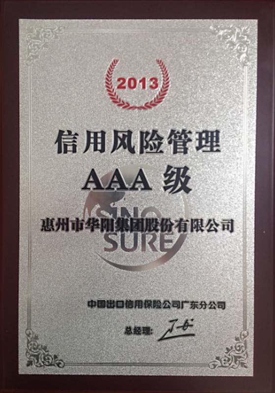 2014年4月,惠州市华阳集团股份有限公司再次获评中国出口信用保险公司广东分公司(以下简称“中国信保”)“2013年度信用风险管理AAA级称号”。该荣誉由中国信保评级并颁发证书。据悉,广东省内共223家出口企业分别获得中国信保颁发的“AAA”“AA”“A”的信用风险管理企业称号,其中AAA级企业仅23家。惠州市华阳集团股份有限公司因在提升风控水平,稳定企业经营方面取得显著成效,连续多年获得该级评定。中国信保的出口风险管理评级是国内信用评级的权威机构。华阳2008年评级为A级,2009年为AA级,2011年至今连续三年获评AAA级,代表着公司的实力和信誉度的稳定提升,同时,也是对公司诚信经营行为的肯定,为公司更好的参与海外市场竞争提供了更有利的外部环境基础及条件。