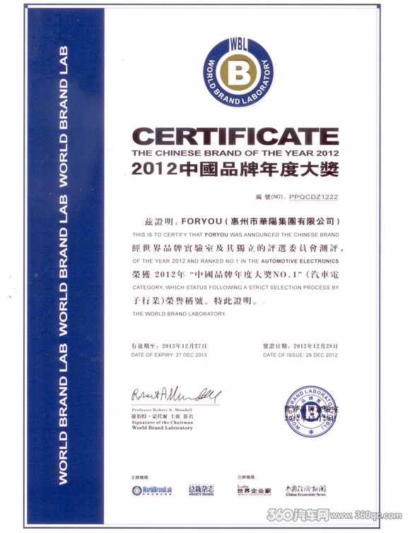 12月29日,享有“中国品牌奥斯卡”之称的 “世界品牌实验室2011年中国品牌年度大奖评选”结果在香港举行的“总裁世界年会”上揭晓。国内汽车电子装备巨头——华阳集团旗下Foryou品牌当选“中国品牌年度大奖”,并荣膺总榜第23位。同时当选的还有工商银行、中国国际航空、北汽集团、华为、长虹等50个活跃在2011年度中国经济舞台的领军品牌。