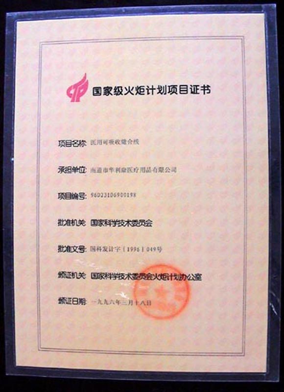1996年,南通华利康医疗用品有限公司的医用可吸收高分子合成缝合手术线项目研制成功,获准列入国家级火炬计划。