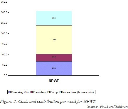 Figure 2 show the costs calculation and contribution per week for NPWT. The comparison shows that NPWT reduces the total costs for treatment in a week's time compared to the conventional dressings.